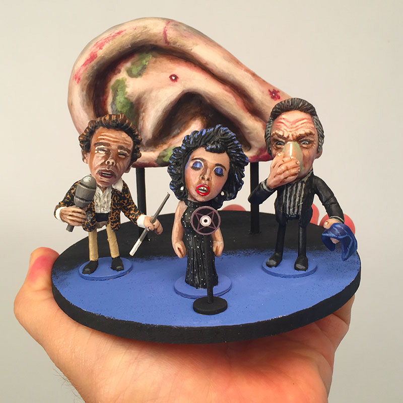 Podemos destacar de entre todas la obra de Steve Casino sobre Terciopelo Azul realizada con cacahuetes tratados y pintados, o el sorprendente diorama en cartulina de Fernando Mircala sobre Rabbits, la asombrosa obra puntillista de Kodomos que recrean la maqueta idealizada de Joseph Merrick con pasajes de la película, la tierna escultura de Rafa Toro sobre el hombre Elefante, la riquiña señorita de la estufa de Cabeza Borradora pintada por Mizna Wada, el collage retrato del Agente Cooper de María Picassó, el dulce retrato de Joseph Merrick realizado por Abigail Larson… la realidad es que todas son una pasada para cualquier cinéfilo en general y para los seguidores de David Lynch en particular.